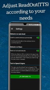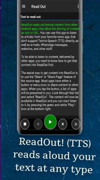 Uygulama, telefonunuzun TTS işlevini (Metin Okuma) kullanır. Üreticinin türüne ve işlevin uygulanma şekline bağlı olarak, çeşitli ayarlar yapılabilir (örneğin farklı bir ses seçilmesi). Bu ayarlamaları cep telefonunuzdan aramanız gerekmez, çünkü "ReadOut!", uygulamanın ayarlar bölümünde size bu ayarlamaları yapabileceğiniz bir bağlantı sunar.