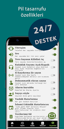 • ekranı kapalı tutmak ve pilden tasarruf etmek için kulaklık veya ses düğmeleri veya yakınlık sensörü ile tesbih sayısını artırmayı/azaltmayı seçebilirsiniz.