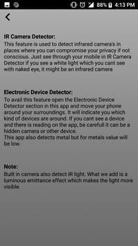 Hidden Camera Detector and Device Detector allows you to detect hidden camera and devices in your surroundings either by the use of Camera Detector feature of this app or by sensing the magnetic field of the electronic device.