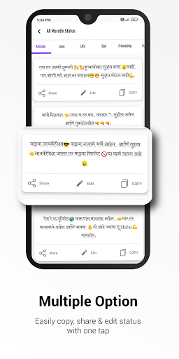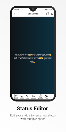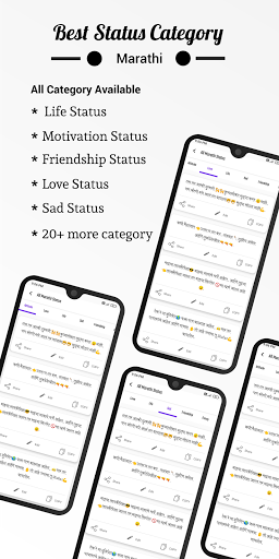 Son Marathi statüsü, Shayari & amp;Güzel ve çekici bir tasarıma sahip editör.Bu uygulamayı çevrimiçi veya çevrimdışı kullanabilirsiniz.Haftalık yeni मराठी स्टेटस güncellendi.
