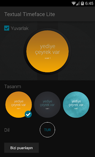 Alışılmış akrep ve yelkovan ile sayıların aksine, Timeface size saati metin olarak sunuyor. Saatte 6:45 yerine yediye çeyrek var yazıyor.