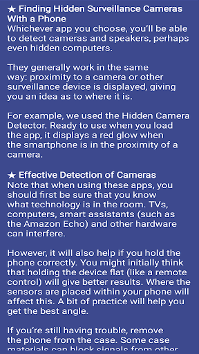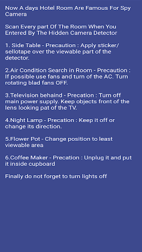 Hidden devices detector free app for android will detect spy devices like hidden spy camera hidden spy microphone bugs infrared camera, so do not wait download this hidden spy devices detector app for android now. The Radiation meter show possibility of spy devices. people are searching for application to find spy devices like hidden camera detector and bug detector and spy microphone finder. this hidden devices is solution for all spy devices finder. To find hidden spy devices it is now very easy to scan hidden spy devices.