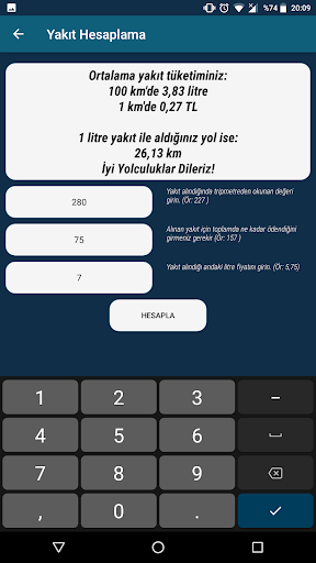 -Yakıt Hesaplayıcı; yakıt tüketim verileri gösteren bir araca sahip olmayanlar için bir hesaplama çözümü. "100 km'de ortalama yakıt tüketimi", "1 litre ile ortalama alınan yol" gibi veriler sunar.