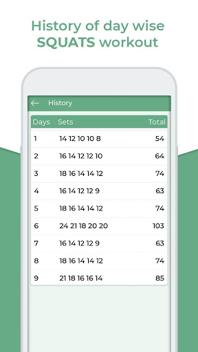 200 Squats Workout Challenge also displays statistics and history of day wise squat workouts done. You can also reset or clear your squat workout plans. You can set time of daily reminder to do squats workout.