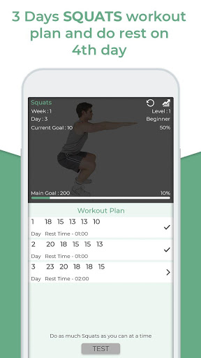 Do squats for 3 days as per workout plan and take rest on 4th day. Do test squats as much you can do at a time and set your test result. System will generate next 3 days squats workout plan based on your test results if your result is less than 200.