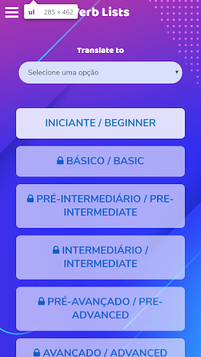 Welbe App é o aplicativo que gera provas de verbos em inglês. A primeira versão conta com 330 verbos, divididos em seis níveis (do iniciante ao avançado). Uma parte do nível iniciante vem destravada para você e para liberar o restante ou outros níveis, você deverá cumprir missões que consistem em realizar provas de verbos e tirar uma nota mínima para testar suas habilidades em tradução, infinitivo, passado simples, passado particípio e um mix de todos estes.