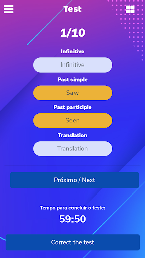 Saber verbos facilita a comunicação, então comece agora mesmo seus estudos. Na versão gratuita, você poderá fazer um teste por hora, com a exibição de uma breve propaganda. Legal né?