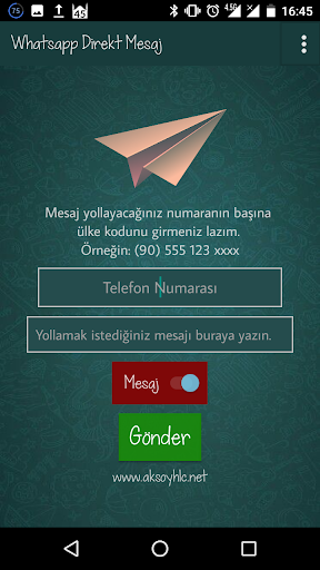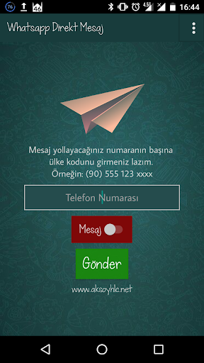 Bildiğiniz üzere whatsapptan bir kişiye mesaj yollamak istiyorsanız onu önce telefon rehberinizi kayıt edip sonradan mesaj yollamanız gerekiyor tabi buda sizin vaktinizi aıyor bizde vaktiniz boşa gitmesin diye rehberinizde kayıtlı olmayan kişilere istediğiniz zaman Whatsapp üzerinden mesaj yollamanız için bu uygulamayı geliştirdik.