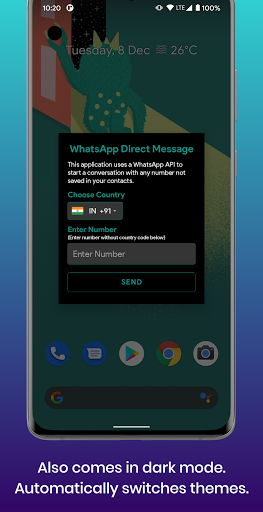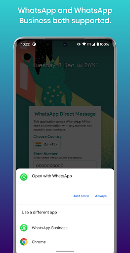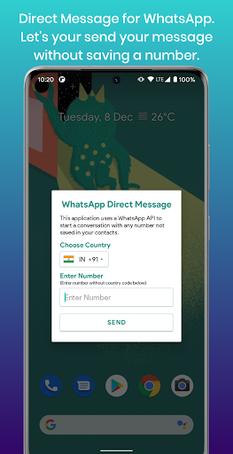 - Direct Message for WhatsApp uses official WhatsApp Public API to open a chat without saving the number.