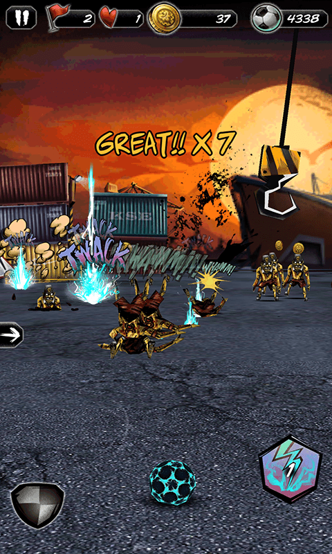 The game screen uses the American cartoon style, the dynamic effect of the comic used in the commonly used sound and painting out of performance. And the level of the screen layer through the layers of 2D performance. This way the game through a simple way to get a good sense of blow and picture effects. The scene of the game is very rich, the beginning of Xiaobian also thought to be in the first off the football field "kick" to the old days old, after crossing the surprise to find there are container terminals, amusement parks and ancient Colosseum and other levels of the scene.