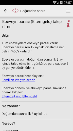 Baby-Berlin Uygulaması hamilelik dönemi ve doğum sonrası için gerekli tüm randevuların, tarihlerin ve yapılacakların unutulmaması için size yardımcı oluyor. Uygulama, hangi maddi yardımların ve malzeme yardımlarının ne zaman ve nereden talep edilebileceği ve bunun için hangi evraklara ihtiyaç duyulduğu konusunda size bilgiler sunacaktır.