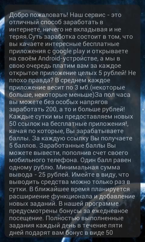 Welcome to the Make money !. Our service - a great way to make money online, without investing anything and not teryaya.Sut earnings is that you shake your interesting free apps with google play and discover on your Android-device, and we in turn pay you for every open application as much as 5 rubles! Not bad right? On average, each application weighs in at 3 MB. (Some more, some less) for half an hour you can earn without much straining of 200, and even more rubles! Every day we offer 50 new links to free applications !, shaking on that, you earn points. For each link you will get 5 points. Earned points you can deduce, recharge your mobile phone. One point equals one dollar. Minimum withdrawal amount - 25 rubles. Keep in mind that you can withdraw funds only once a day. In the near future rasshirienie functionality and add new jobs. Our program provides bonuses for daily visits. Fully completed assignments each day for five days will give you a bonus of 50 points Make Money.
