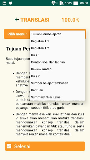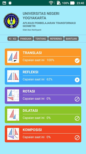 Aplikasi Transformasi Geometri ini berisi 5 menu utama yaitu - Translasi - Refleksi - Dilatasi - Rotasi - Komposisi