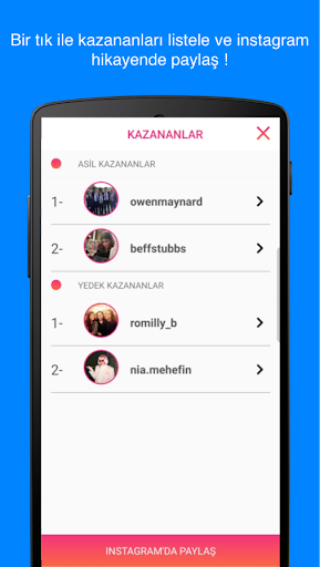 instaprize ile instagram ŞİFRENİZİ GİRMEDEN istediğiniz zaman, kolayca çekiliş yapıp sonuçlarınızı instagram hesabınızdan paylaşabilirsiniz.