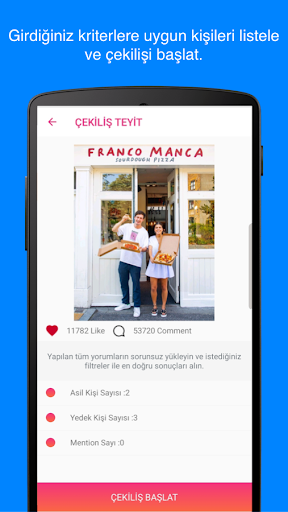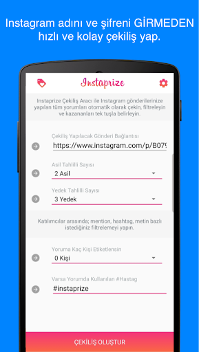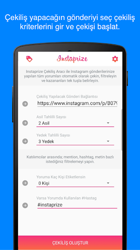 instagram çekilişi yapacağınız kriterleri girerek, kriterlere göre instagram gönderinizi çeker sonucu hızlıca takipçilerinize paylaşabilirsiniz.