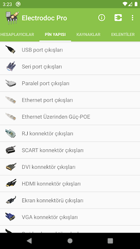 • Port bağlantı dizilimleri (USB port çıkışları, Seri port çıkışları, Paralel port çıkışları, Ethernet port çıkışları, POE-Ethernet Üzerinden Güç, RJ konnektör çıkışları, SCART konnektör çıkışları, DVI konnektör çıkışları, HDMI konnektör çıkışları, Ekran konnektörü çıkışları, VGA konnektör çıkışları, S-video konnektör çıkışları, VESA konnektör çıkışları, Jack konnektörü çıkışları, FireWire konnektörü çıkışları, RCA konnektörü çıkışları, Ses DIN konnektörü, XLR ve DMX konnektör çıkışları, ATX güç konnektörü çıkışları, PC Molex konnektörü çıkışları, EIDE/ATA - SATA çıkışları, PS/2-AT konnektörü çıkışları, 25-çiftli telefon kablosu renk kodları, Fiberoptik kablolar için renk kodları, MIDI çıkışları, MIDI/Oyun portu çıkışları, Apple 30 Pinli Konnektör çıkışları, Apple Lightning konnektörü, PDMI çıkışları, OBD-II araba konnektör çıkışları, Araba ses sistemi ISO konnektörü, Römork/Treyler konnektörleri, SD kart çıkışları, SIM/Smart kart, Raspberry Pi pin çıkışları, LCD pin yapısı, GPIB/IEEE-488 pin yapısı, Termokuplör renk kodları, Arduino kartları pin yapısı, JTAG pin çıkışları, BeagleBone kartları)