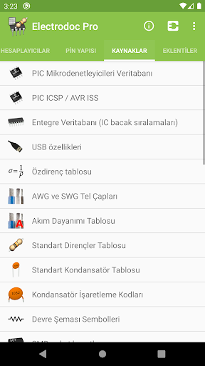 • Kaynaklar (PIC ICSP / AVR ISS, Entegre Veritabanı (IC bacak sıralamaları), USB özellikleri, Özdirenç tablosu, AWG ve SWG Tel Çapları, Akım Dayanımı Tablosu, Standart Dirençler Tablosu, Standart Kondansatör Tablosu, Kondansatör İşaretleme Kodları, Devre Şeması Sembolleri, SMD paket boyutları, Semboller ve Kısaltmalar, SI Birim Sistemi Kısaltmaları, ASCII Tablosu, Mantıksal (Lojik) kapılar, 7400 serisi IC, Anahtar bilgisi, 78XX Entegreler, Bataryalar, Para Şeklindeki Piller, Desibel Tablosu, Radyo Frekansları, PT100 Çevrim Tablosu, Sigorta renk kodları, Otomobil sigorta renk kodları, DIN 47100 renk kodlaması, IP koruma derecelendirmesi, Dünyadaki Fiş & Prizler, IEC Konnektörleri, NEMA konektörleri);