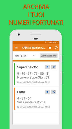 - Lotto: Da 1 a 10 numeri con possibilità di generare anche la ruota sul quale giocarli.