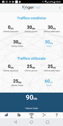 It’s, above all, a perfect tool to keep under control both the internet traffic consumed by your device and that used and shared by the Fingernet application. By setting thresholds at your discretion you will receive notifications when you have reached the limit you set, you will be able to see and keep under control how much data traffic you have consumed in a single day, week, month or since you installed the app.