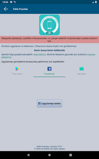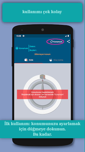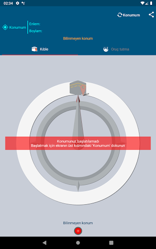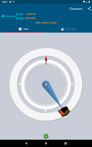 Coğrafi konumunuza göre Kıble yönünü hesaplar. Uygulama bunun için kuzey yönünü referans olarak kullanır ve bu nedenle cihazın manyetik alan sensörüne ihtiyaç duyar. İki durum: