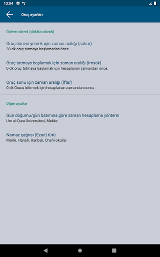 Uygulama her gün sizin için orucun tam başlangıç ve bitiş zamanlarını hesaplar. Bu hesaplama, coğrafi konumunuza göre otomatik olarak yapılır. Size kolaylık sağlamak için şu seçeneklere sahipsiniz: