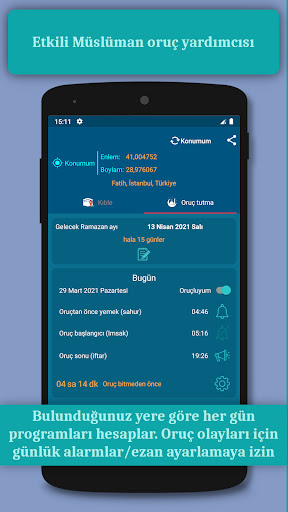 • Oruç vakti (İmsak) ve oruç son (İftar) için hesaplanan zaman için alarm kur.