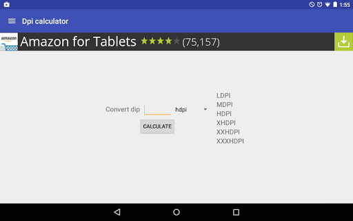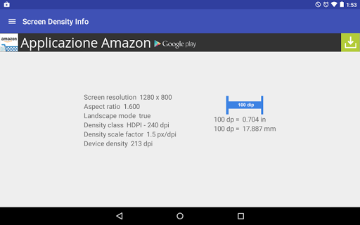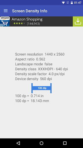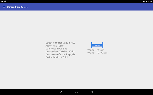 This tool is usefull to display informations about screen resolution and on density for devices. It will able to display the screen resolution, the aspect ratio of screen, if screen is in landscape mode, the density class (ldpi, mdpi, hdpi, xhdpi, xxhdpi, xxxhdpi), the scale factor and the device screen density. There is a image large 100dip. I put it just to display conversion between dp and inc and conversion between dp and mm.