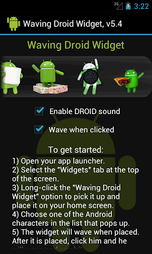 Note that this is a widget for your home screen. The app also places an icon in your app launcher where you can enable or disable the DROID sound and/or whether the widget waves when clicked. It also includes directions on how to select and place a home screen widget.