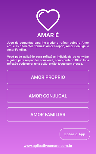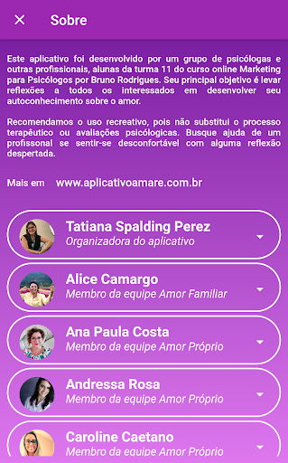 Este aplicativo foi desenvolvido por um grupo de psicólogas e outras profissionais, alunas da turma 11 do curso online Marketing para Psicólogos por Bruno Rodrigues. Seu principal objetivo é levar reflexões a todos interessados em desenvolver seu autoconhecimento sobre o amor.