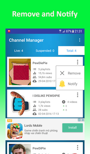 - Gerçek Zamanlı Abonelerin ve Kanalın Görüşlerini Kontrol Edin - Kanalın Abonelerine Ulaştığında Kullanıcı İçin Bildirin - Kanalın Görüşleri Gönderildiğinde Kullanıcı İçin Bildirin - Kanalın Yeni Video