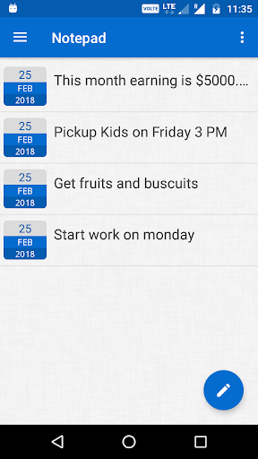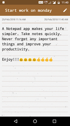 The date of the the notes are shown as in the list view of the home page, which makes easy to edit the notes. Take advantage of changing the theme, fonts with the unique interface. A simple notepad makes life