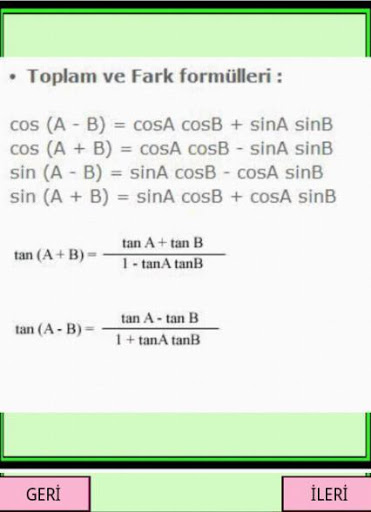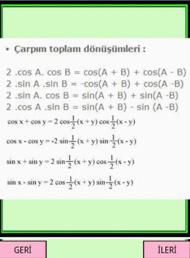 Bu uygulamada MATEMATİK formül leri bulunmaktadır. Hem AYT TYT YKS sınavlarına hazırlanırken hem de lise konularına çalışırken size yardımcı olabilecek bir uygulama dır. Başarılı bir öğrenci olmak ve okul öğretmenlerinin gözde ögrencisi olmak için bu uygulama işinize yarayabilir.