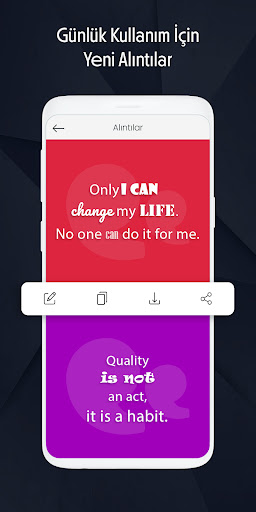 Çarpıcı alıntılar oluşturma seçeneğiyle çeşitli kategorilerde birbirinden güzel motivasyonel ve hayat değiştirici alıntılar.