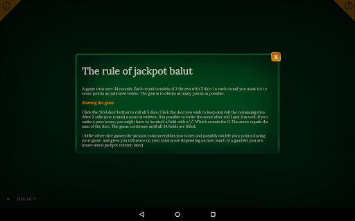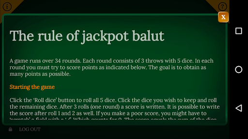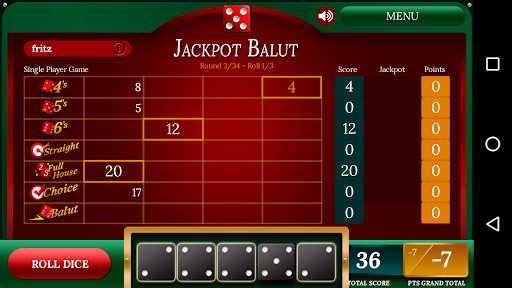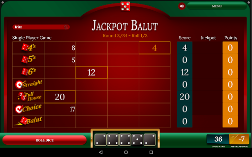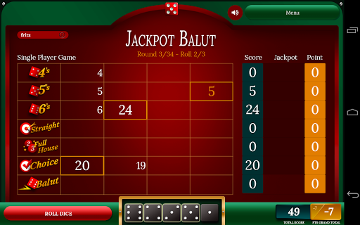 Playing Balut is really easy. Start by rolling 5 dice. Tap to lock/unlock individual dice. You can roll 3 times in each round. Score points by rolling Full House, Straight and other combinations.