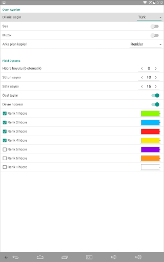 Oyun alanının boyutunu hücre renklerini, ses efektleri, yanı sıra özel taşlar ve bombochek varlığını seçilen oyun ayarları.