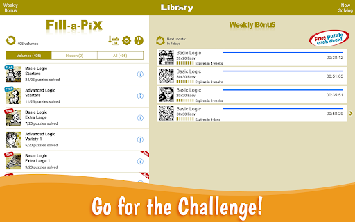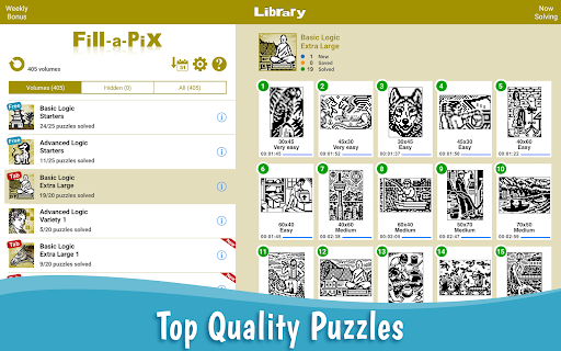 Fill-a-pix heyecan vericiÇözüldüğünde kaprisli piksel sanat resimleri oluşturan mantık bulmacaları.Zorlu, tümdengelimli ve sanatsal olan bu orijinal konsept bulmaca, uzun saatlerce zihinsel olarak uyarıcı eğlence ile çözücüler sağlarken mantık, sanat ve eğlencenin nihai karışımını sunar.Kolay ve hassasiyetle: Bir kareyi doldurmak için imleci istenen konuma taşıyın ve ekranın herhangi bir yerine dokunun.Birden fazla kareyi doldurmak için, imleç kareyi doldurana ve komşu karelere sürüklemeye başlayana kadar parmak ucunu basılı tutun.Oyun ayrıca, kalan tüm boş karelerin bir ipucu etrafında hızlı, tek dokunuşla doldurulması için güçlü bir akıllı doldurma imlecine sahiptir.çözülürken bir ciltte bulmacalar.Bir galeri görünüm seçeneği bu önizlemeleri daha büyük bir formatta sağlar.>