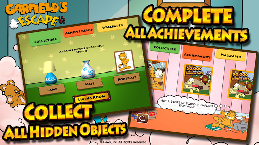 Collect all items in each stage to unlock a special bonus level! You can view your collections on the display table. Complete each stage to receive special-edition Garfield wallpapers as reward! Complete achievements to make each b/w picture show its true colors.