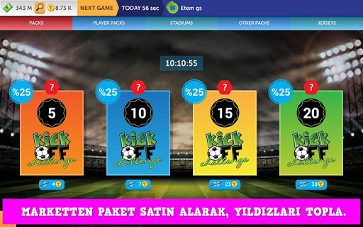 Kick Off Challenge, kartları biriktirerek oynanan bir sosyal futbol oyunudur. 55 binden fazla futbolcu sayesinde kendi takımını kur ve en tepeyi hedefle. 1,2 milyon kayıtlı oyuncusu ile çetin bir mücadele arenası sunan oyunda, stad geliştirmelerinden, antrenman hocalarına, teknik direktörlerden, oyuncu gözlemcilerine kadar biriktirmen gereken sayısız kart olacak. Kartlarını markete koyup satabilecek bu sayede kulübüne ekstra para kazandırıp, yıldız oyuncuları alabileceksin.