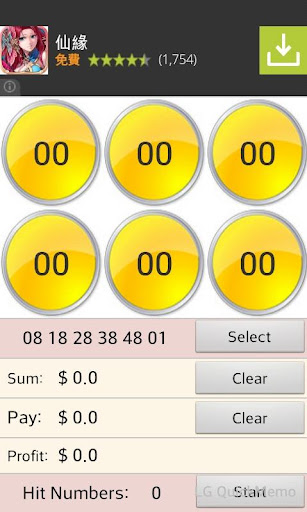 Bu program, ücretsiz versiyonun piyango simülatörüdür ve artan sırada olan altı tamamen rastgele sayıyı simüle eder.Başlat düğmesine basın hemen altı numara oluşturur ve bazı ödeme işlevleri ve bonus birikimi vardır.Aşağıda isabet sayılarının (isabet numarası) miktarını gösterecek ve sanal para sayısı birikecek ve sergileyecek (toplam) ve kümülatif sanal maliyet miktarını (ücret) gösterecektir.Ve sonra sanal piyango ödülünü hesaplayın ve sanal kâr elde etmek için sanal maliyetler çıkarılır.>