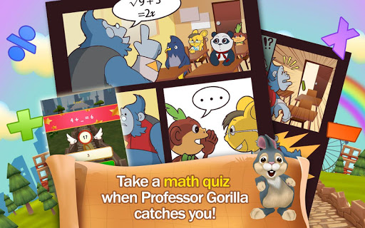 Professor Gorilla is setting a math quiz again - will our cheeky animal friends outrun the professor or get caught and take the quiz? Put your reflexes and math skills to the test in this action-packed game!