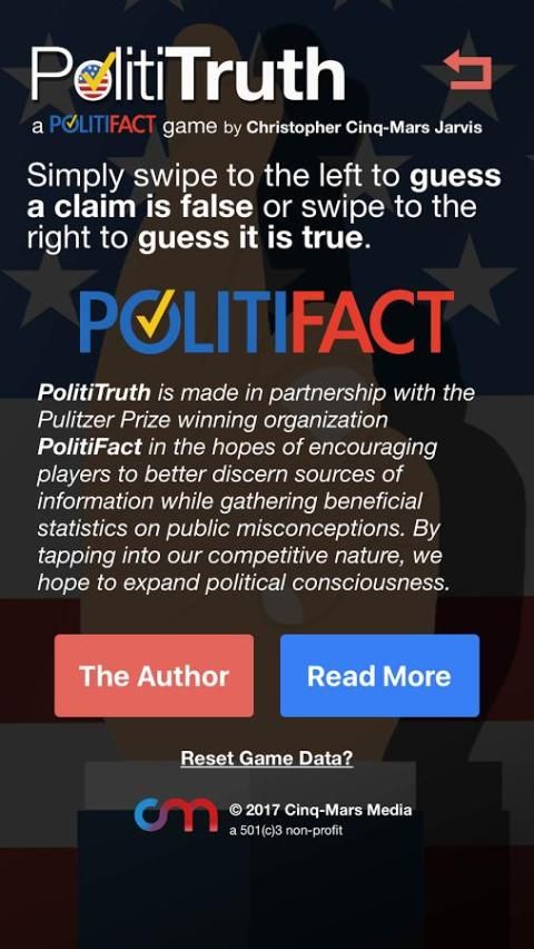 Swipe left to guess a news story is false and swipe right to guess it is true. The game is made in partnership with the Pulitzer Prize winning organization PolitiFact in the hopes of encouraging players to better discern sources of information while gathering beneficial statistics on public misconceptions. By tapping into our competitive nature, we hope to expand political consciousness.