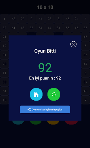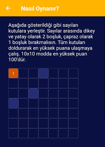 Sayıları sırası ile yatay ve dikey 2 boşluk, çapraz 1 boşluk bırakarak kutulara yerleştirin. En yüksek skora ulaşmaya çalışın. 10x10 modunda en yüksek skor 100'dür.
