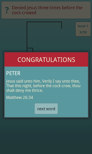 BirkaçEski ve yeni Ahit soruları 20 seviyeye ayrıldı.Doğru hale getirmek için, kelimenin harflerinin veya ilgili bir bahşişin sayısına sahip olacaksınız.Hata daha fazlası ise sadece altı harfi özleyebilirsiniz.Bir kelime ayarlarken, cevabı açıklayan İncil referansı gösterilecektir.Yanlışlıkla, cevabını nerede bulacağınız bir ipucu görünecektir.10 doğru kelime, seviye yukarı ve daha zor kelimelerle oynamaya başlar.