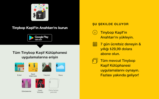 Tinybop Kaşif Kütüphanesi uygulamalarını oynamak için Tinybop Kaşif'in Anahtarı'nı edinin. Önce bunu kurun. Ardından, 7 günlük ücretsiz denemenizi başlatmak için kayıt olun. Yükleyin ve 6 Tinybop Kaşif Kütüphanesi uygulamasını oynamaya başlayın!