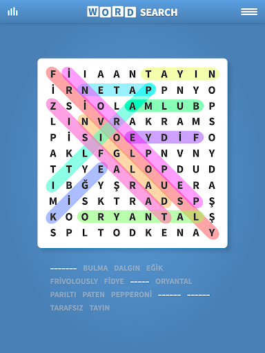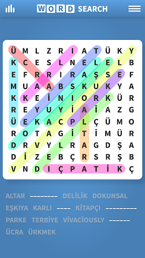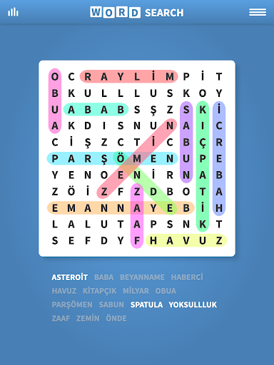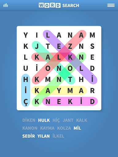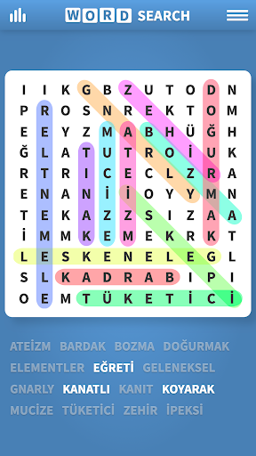 Amacınız, bulmacada gizlenmiş kelimeleri bulmak. Kelimeler yatay, dikey, çapraz, ters çapraz olarak yerleştirilmiş olabilir. Bulduğunuz kelimeleri seçmek için kelimenin ilk harfinden başlayarak kaydırın veya çekin. Zorluk seviyesini artırmak için az bilinen kelimelerin yer aldığı zor ve uzman kelime bulma modlarımızı deneyin.