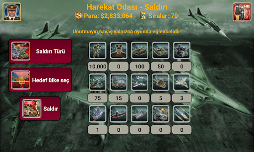 * Zırhlı Personel Taşıyıcıları (ZPT), Tanklar, Topçular, Hava Savunma Füzeleri, Helikopterler, Savaş Uçakları, Gemiler, Denizaltılar, Savaş Robotları, Insansız Hava Araçları (IHA'lar), Uçak Gemileri ve Balistik füzeler dahil olmak üzere çeşitli silahlar.