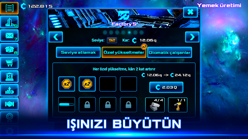 Bu Bilim Kurgu evreni sizi bekliyor. Bir iş adamı olarak, geliştirme stratejinizi düşünün - malları kendiniz üretin, üretim kapasitesini artırın veya küresel pazarda mal satın alın. Oyunda çok zaman harcayın, çok para kazanın veya tembel bir kralı olun ve sadece boşta nakit gelir toplayın. Yeterli oyun parası yoksa, banka kredisi alın. Bu sadece bir tıklama veya boşta kalma veya dokunma oyunu değil, bir iş simülatörü oyunu gibi.