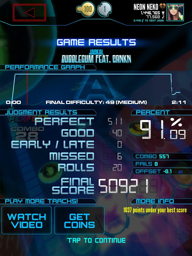 Just like the original arcade music game, many difficulty options for each song allow players of all skill levels to play and compete. Preview songs for free, and groove to a new selection of free music every week. Stick to the rhythm to gain points, earn badges, unlock new songs, and win tokens for even more free play. The mobile and arcade games both receive song updates every 2 weeks or less, ensuring you're playing the newest music and keeping competition fresh! Come see why Neon FM™ is the best music game of the decade!