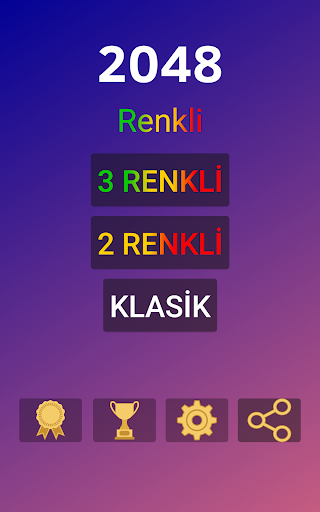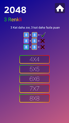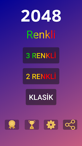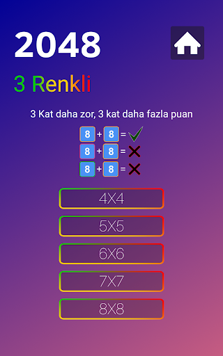 2048 Renkli'de 4x4, 5x5, 6x6, 7x7 ve 8x8 olmak üzere beş farklı zorluk seviyesine sahip 3 Renkli, 2 Renkli ve Klasik seçenek bulunmaktadır.