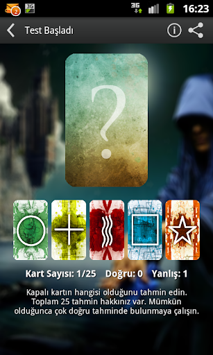 Kural basit ; size sunulan 5 karttan hangisinin doğru kart olduğunu tahmin etmelisiniz. Ne kadar çok doğru tahmin ederseniz duyu ötesi algı gücünüzün o kadar gelişmiş olduğu söylenebilir. Sürekli tekrar yaparak bu özelliğinizi geliştirin.